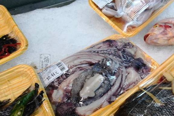 此次的特惠基围虾明显都是许多死虾,所以虾头几乎都脱落了,说明死亡时间较久了,它散乱的摆放在货架上,虽然价格昂贵,可是这样看着实在不能让人产生购买的欲望,也不要购买哦3、鱿鱼脚:我最讨厌吃的就是鱿鱼脚,鱿鱼脚的多汁Q弹,无论是炒着吃或是烧烤都十分合适。