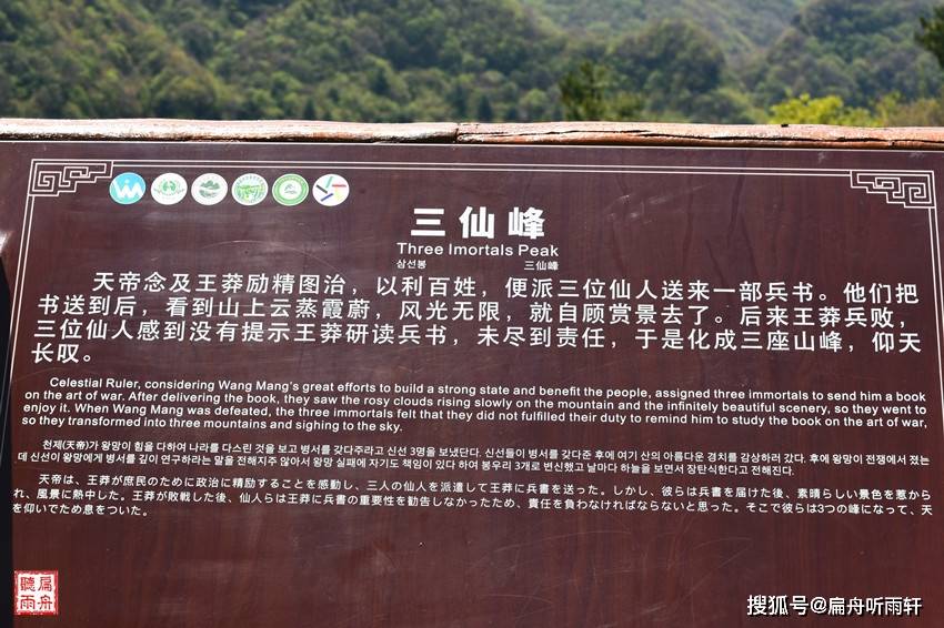 相传,上天看汉武帝追剿光武帝辛苦,就派了三位仙人带着兵书前来帮助帮助汉武帝到了此地,三位仙人被美景吸引,先把书压于大石头地下结果,暴雨突至,淋坏了兵书,汉武帝错过了神授机宜,兵败光武帝,一蹶不振三位仙人羞愧难当,不敢再回天上,就在此化为三座山峰,人称三仙峰。