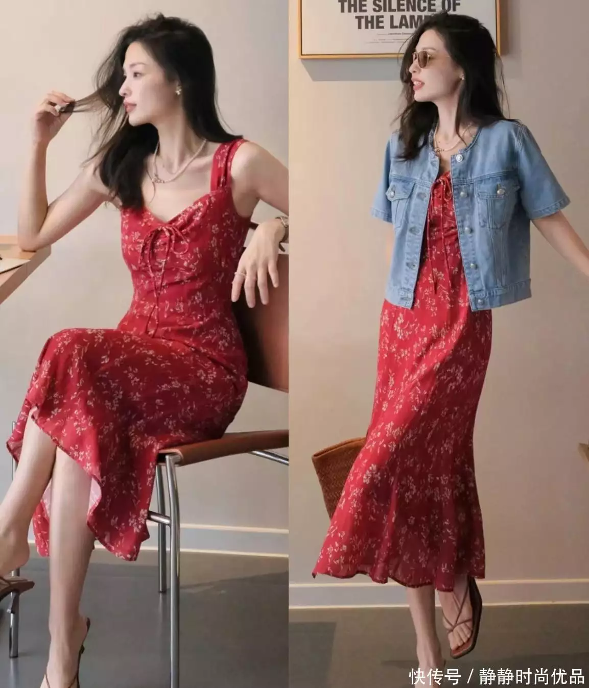 如果想要追求成形的妩媚感,那么建议裙身采用较为俐落流畅的裁剪,不要将裙子外扩成较为大的弧度,收身的设计更显男人味红色的裙装,单穿是热烈俏丽的妩媚感,而与牛仔外套配搭,则是高级又摩登的港式女郎风范