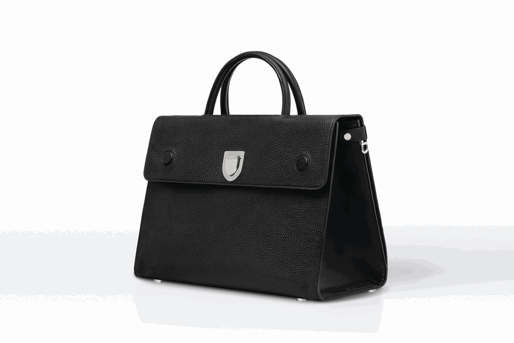 简单利落的轮廓融合了一包两用的的新概念,可以把翻盖完全打开,折到后面,翻盖上的皮质磁钉就会吸到包背面的磁钉上。有磁钉固定,你不用担心翻盖会挡在包口。