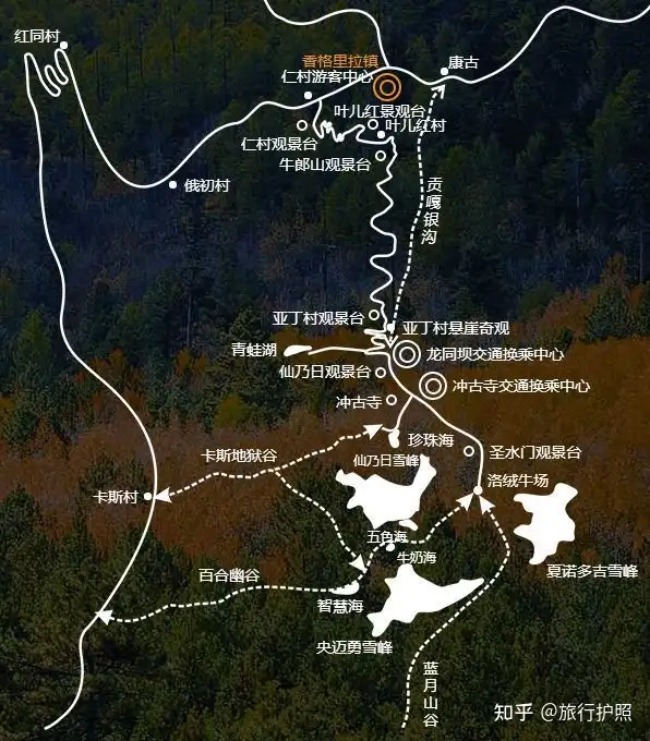 巴士拉旅游区央迈勇山下1、合耳-夏都镇仁村售票中心(乘观光车)-扎灌崩(观光车终点)-冲古草甸、冲古寺、珍珠海(卓玛拉措)、仙乃日山下-返回巴士拉村或夏都镇入住2、巴士拉村或夏都镇乘坐观光车-扎灌崩(观光车终点)-冲古草甸(乘电瓶车)-卓林寺Sangrur(电瓶车终点、徒步起点)-果汁海(徒步)-五彩海(徒步)-卓林寺Sangrur(乘电瓶车)-冲古草甸-扎灌崩(乘坐观光车)返回夏都镇-合耳。
