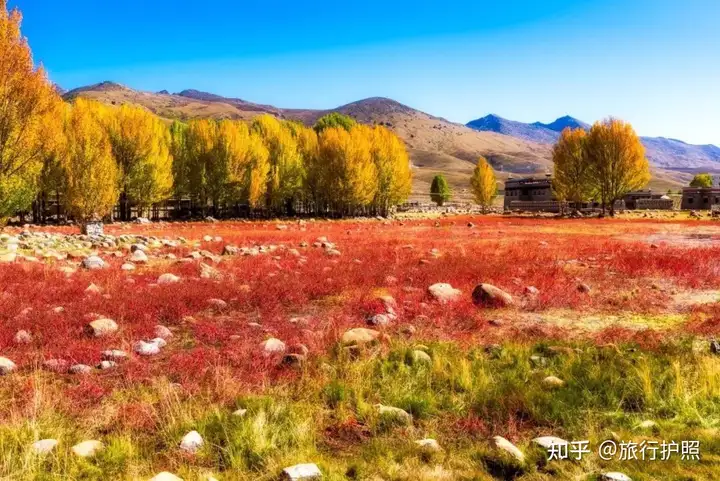 红草地位于桑堆小镇距合耳县城西北28km,牧场在公路沿线平展铺开,河水静静地从中穿流而过遥望远处,在起伏的山峦间散落着村落、牧人、牛羊,呈现一派宁静祥和的景象(红草滩的季节性很强,每年仅在秋季出现,而且时间很短,只有十几天时间(10月初到中旬)可以看到)。