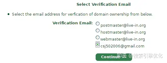 优先选择两个验证的电子邮箱,有postmaster@域名、hostmaster@域名、webmaster@域名、和注册登记域名时的电子邮箱。