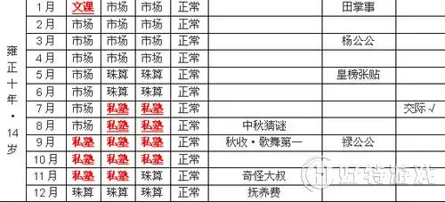 八月:育幼堂 育幼堂 育幼堂九月:育幼堂 育幼堂 育幼堂十月:育幼堂 育幼堂 育幼堂【比赛选择 舞文弄墨】十六月:客栈 客栈 客栈十二月:客栈 客栈 客栈【第二年】六月:市场 市场 市场【言谈 心机,减少无用属性亲和】
