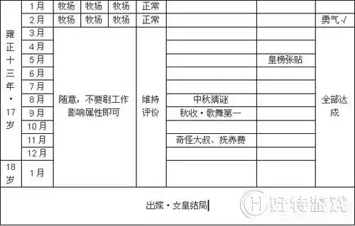 【达成统御>600】下半年:农业课(心智 感受)【达成心智>750】【第六年】上半年:戏班(气质 气质,减少无用属性臂力)【达成气质>600】七月八月九月:赌场(自恋 堕落,减少无用属性亲和)《皇太后高速成长方案2》
