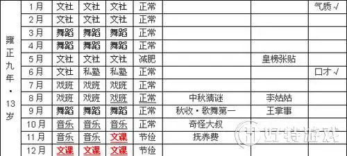 ①育幼堂,首年秋收节歌王争雄得第二名;亲和>800停止;②法度课,以后秋收节京城之花第二名;礼仪>600停止;③现代舞课,现代舞满500停止;④茅山术,小双侠满300停止;⑤家塾,伦理满500停止;⑥武术课,武术满800停止(一定要经常用道具武经习要 4,牛皮护腕 3);