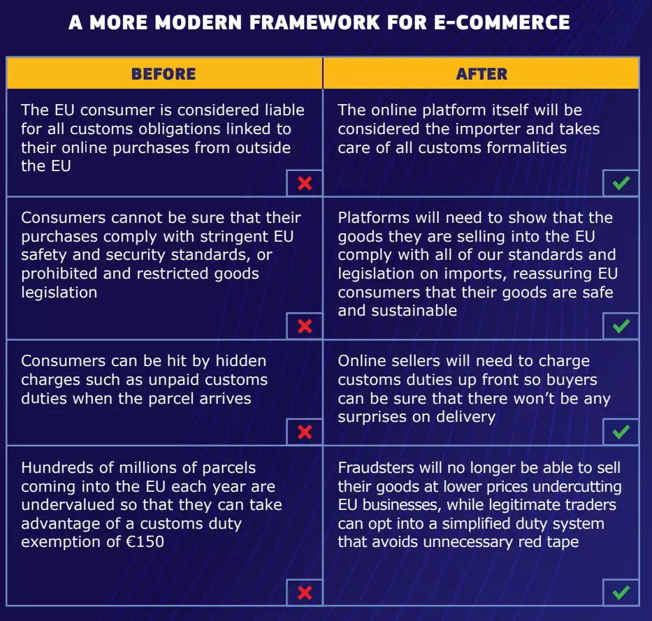 (欧洲联盟B2C出口税新政对比,作者:欧洲联盟、ChatGPT)最为关键的一点是,欧洲联盟还计划去除现阶段150英镑以下出口货物运输豁免的经济政策欧洲联盟则表示,现阶段进入欧洲联盟的包覆中,大约有65%的订单存在故意低估商业价值,从而受益于此项经济政策。
