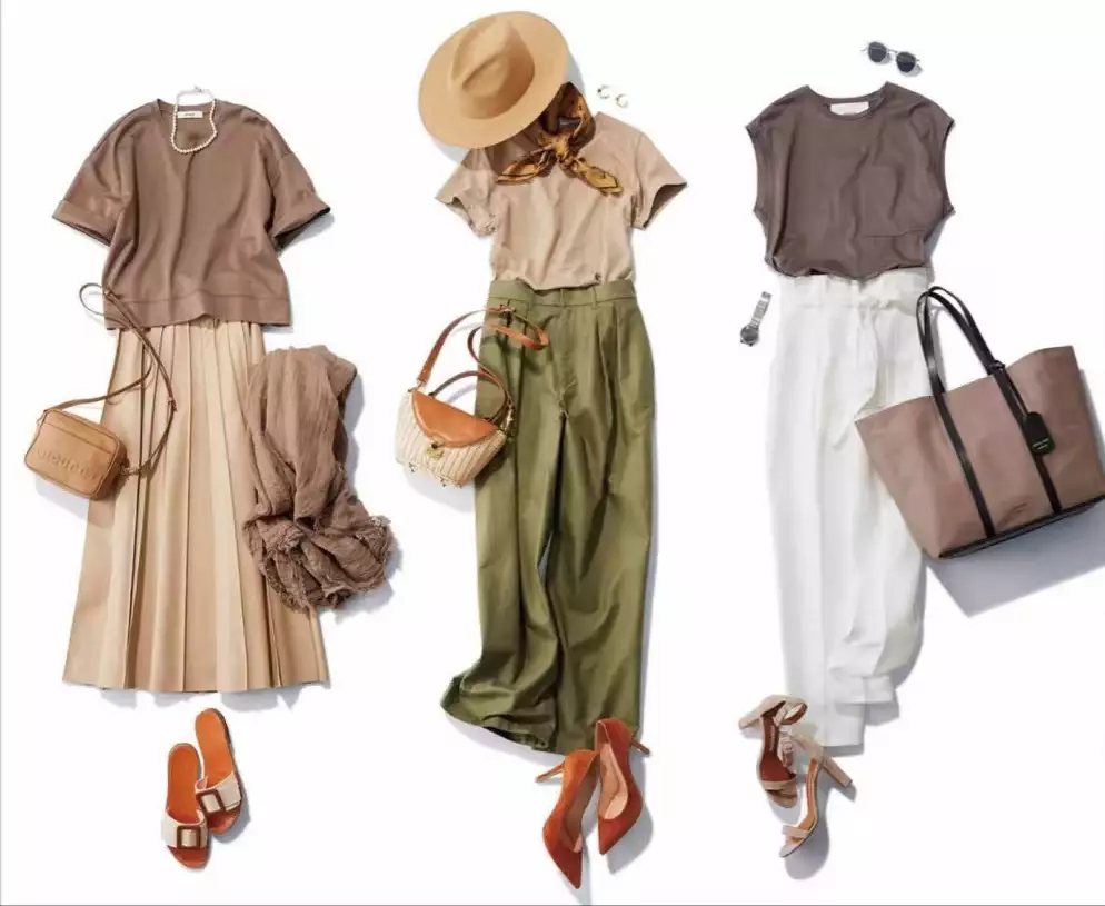 7件辅助配饰:蓝色花苞裤、米白牛仔裤、黄格半裙、暗红吊带裙、黑色背带裤、棕色工装外套、白色轻薄风衣抛开外套不说,2条裤子、一条半裙、一条吊带裙、一条背带裤,经典有个性,颜色百搭,艺术风格有亮点,很容易为T恤赋能。