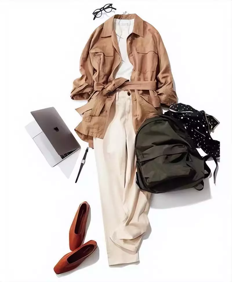 一件白T恤,退可休闲,进可激昂,化身职场风尚的百变张力与米白牛仔裤、卡其工装外套一起,打造办公室的大气行头红棕色单鞋点缀,取自红白配意象,经优雅过滤,高级很多哦黑色双肩包+丝巾,又是直曲互补的好戏