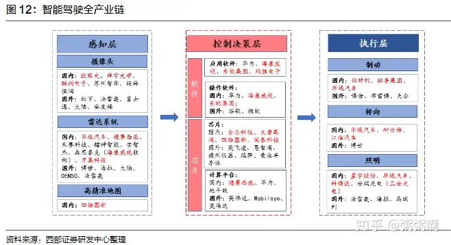 1)各个环节交互感应器:主要就主要包括视觉控制技术,如摄像头、夜视仪等;及雷达控制技术,如激光雷达、毫米波雷达等;2)控制重大决策控制技术:主要包括操作控制技术、应用领域软件、晶片及计算平台等;3)执行层:主要包括制动、转向、照明等此外,还涉及车内通讯控制技术、高精准地图等各个环节。