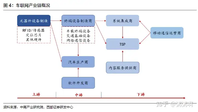 虽然该各个环节控制技术准入门槛相较较高,且市场刚刚起跑,多为中小或孵化器型企业参与;3)下游:主要就主要包括TSP、控制技术软件系统商、内容服务提供商和移动通讯运营商移动通讯运营商以中国移动、中国联通和中国电信为主;车联网服务提供商方面,包含传统TSP供应商如吉安星等、各大主机厂自建TSP平台及新兴的孵化器企业等。