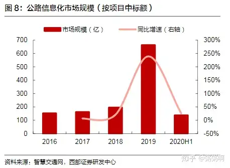 2)公路重要信息化领域:2019年,公路重要信息化千万项目中标708项,合计金额662.5亿,同比+239.5%,2019年大幅增长的主要就原因是国内取消高速公路省界收费站带来的相关项目采购建设大幅增加;2020上半年千万项目市场规模136.55亿元,同比+25.66%,项目数量166项。