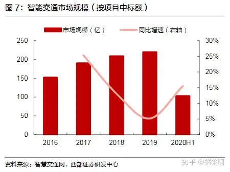 蜂窝联阿仙奴协作市场规模增长迅速1)城市智能化交通领域:2019年,城市智能化交通千万项目中标1268项,合计金额219.4亿元,同比+5.13%;2020年上半年,千万项目市场规模102.54亿元,同比+15.51%,项目数量512项。
