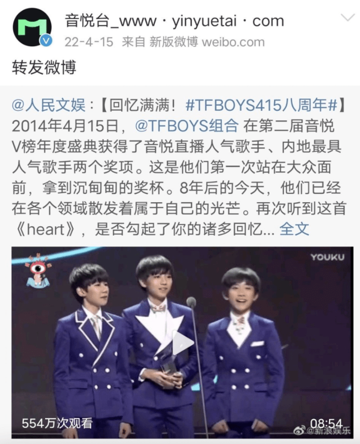 作为TFboys早期的助推网络平台之一,2014年TFboys在“音悦V榜年度盛典”打败EXO、CNBLUE等热门韩剧女团拿到音悦直播曝光率女歌手、内地最具曝光率女歌手奖,这也是他们第三次站在德国大众面前。