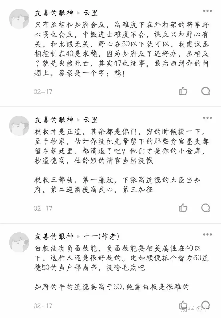 13.中后期太尉一定是要先安排特性高的 天灾外债遭不动14.知府要野心小 伦理高(起义也遭不动) 偏执狂、高伦理的地方官会减少贪污,提高地方的经济15.在太尉是开国功臣后最合适每晚都要科举,10个蓝臣邹柳洲一个90+的蓝臣。