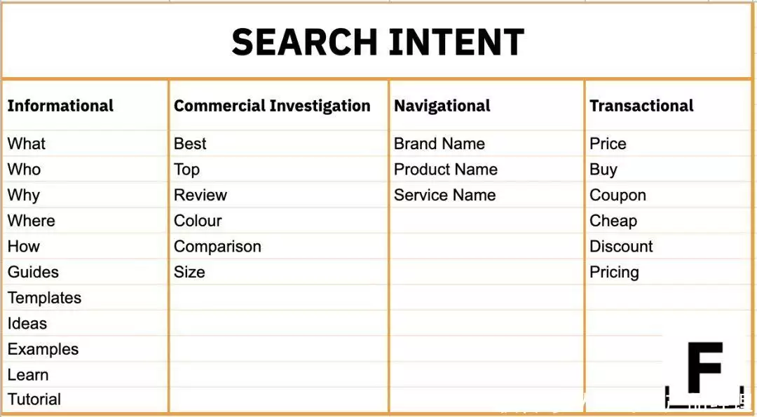 信息:通过搜索找到某个特定信息;商业调研:通过搜索比较不同产品来找到最适合的;导航:通过搜索找到某个特定产品、服务或者品牌;交易:通过搜索找到某个特定产品来购买、使用或者下载内容营销机构Foundation按照上面这四个分类,整理出了相对应的可能关键词样例:。