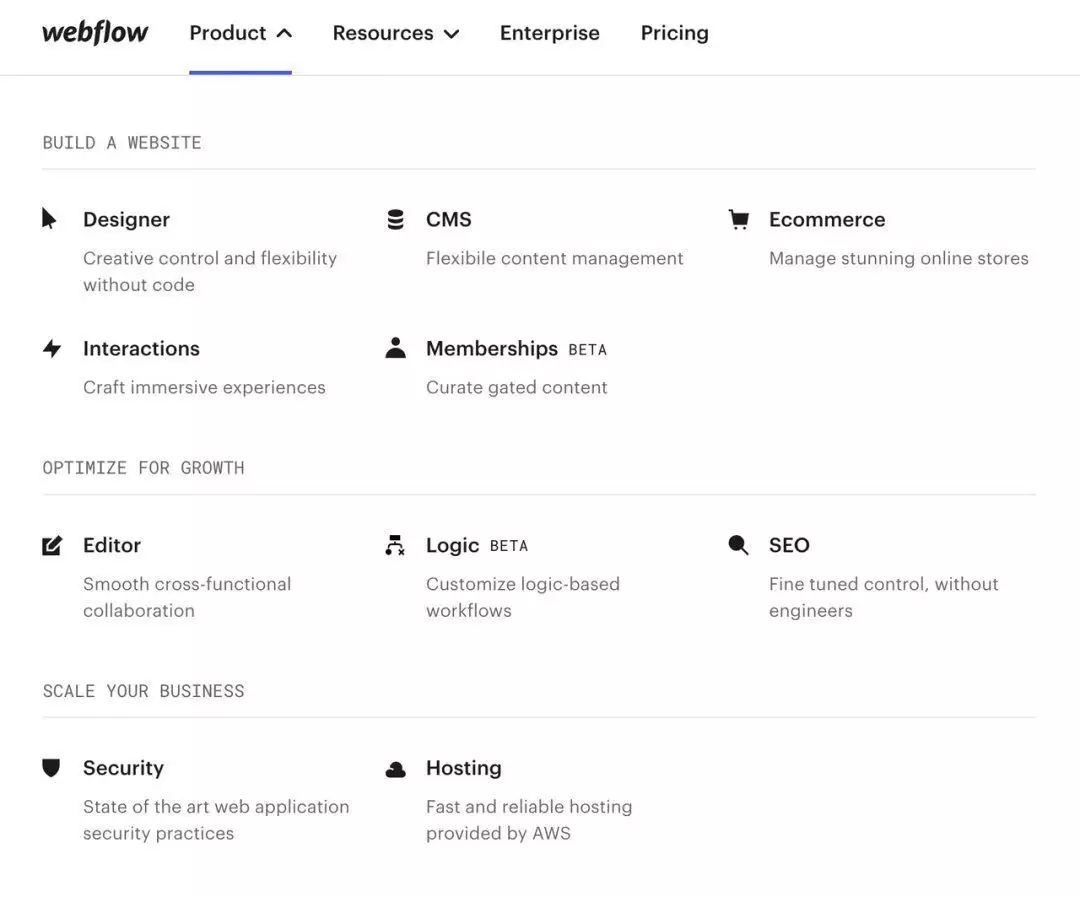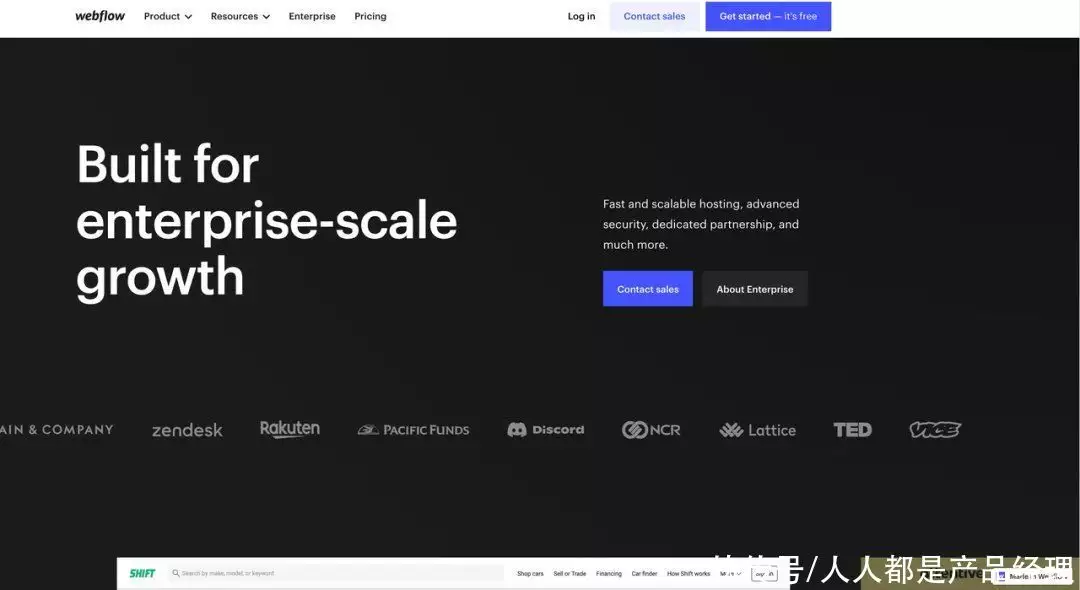 Security(安全)、Scale(规模)和Support(支持),而这些需求的差异化,可以根据企业人数的规模来进行预测和区分Webflow也专门针对企业级的客户调整了定价,这里的核心考虑点就是刚刚提到的——。