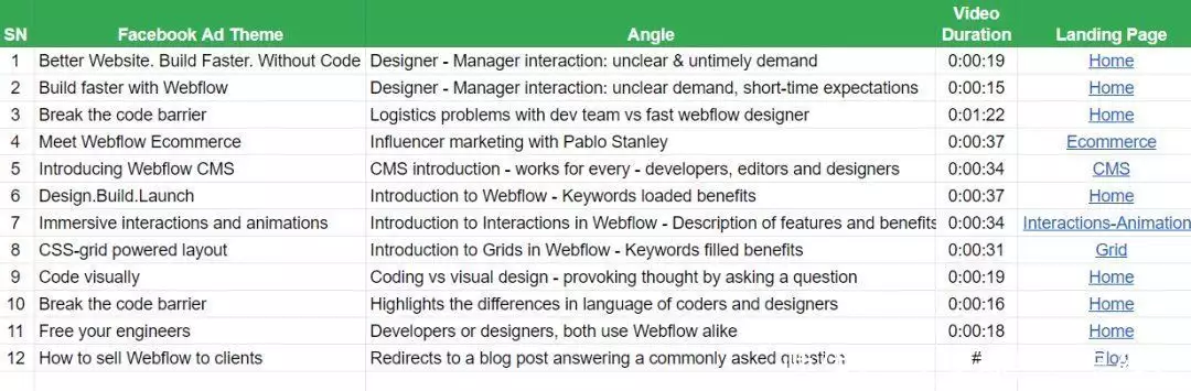 在Facebook上主要以视频信息流广告为主,每个短视频针对不同人群的痛点展开,比如开发者、设计师和管理者等这种方式很好地利用了信息流推送不同目标人群的功能,来直观展现Webflow的产品特性,从而吸引用户点击并注册。