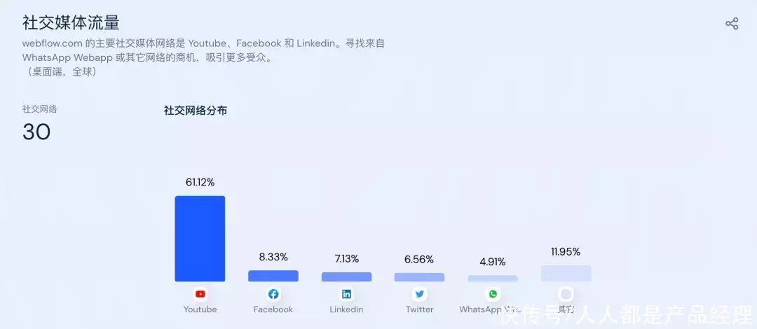 以上这些基本都是基于Webflow自身生态私域内的增长策略,而在社交网络平台等公域方面,Webflow也做得十分不错从下面来自Similarweb的数据图可以看到,Youtube是第一大流量来源,且占比达到了61%,紧接着是Facebook和Linkedin,这两个渠道合起来占比超过了15%。