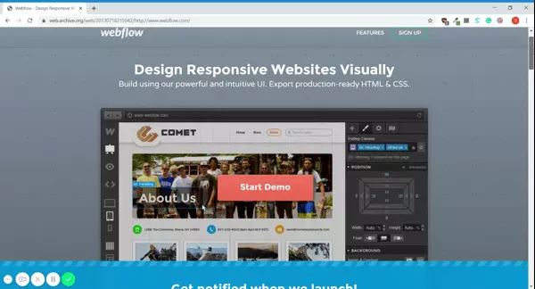 从产品定位上看,Webflow的主要是以下四个方面:设计、搭建和发布;无代码和拖拉拽;响应式网站设计;HTML元素级自定义这四个定位也直接体现在了Webflow官网的设计和布局上,首先是2013年版的官网,我们可以看到他们特性功能点聚焦在。