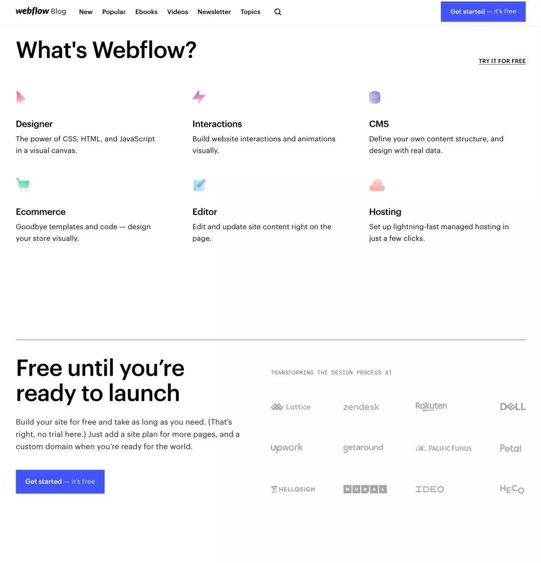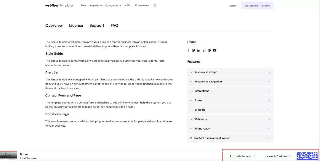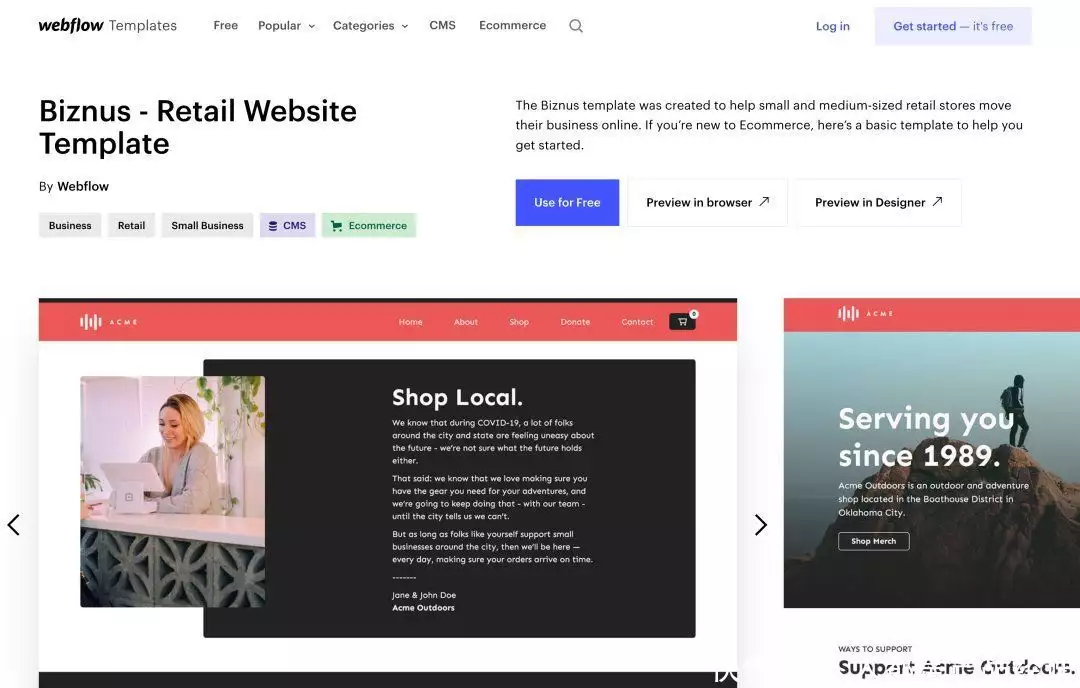而在介绍下方是三个CTA的按钮,“Use for Free”重点强调免费使用,从而引导用户注册转化旁边的一个按钮,一个是直接在浏览器预览模版,另外一个则是直接打开精简版的编辑器,让用户快速上手体验Webflow的开发方式。