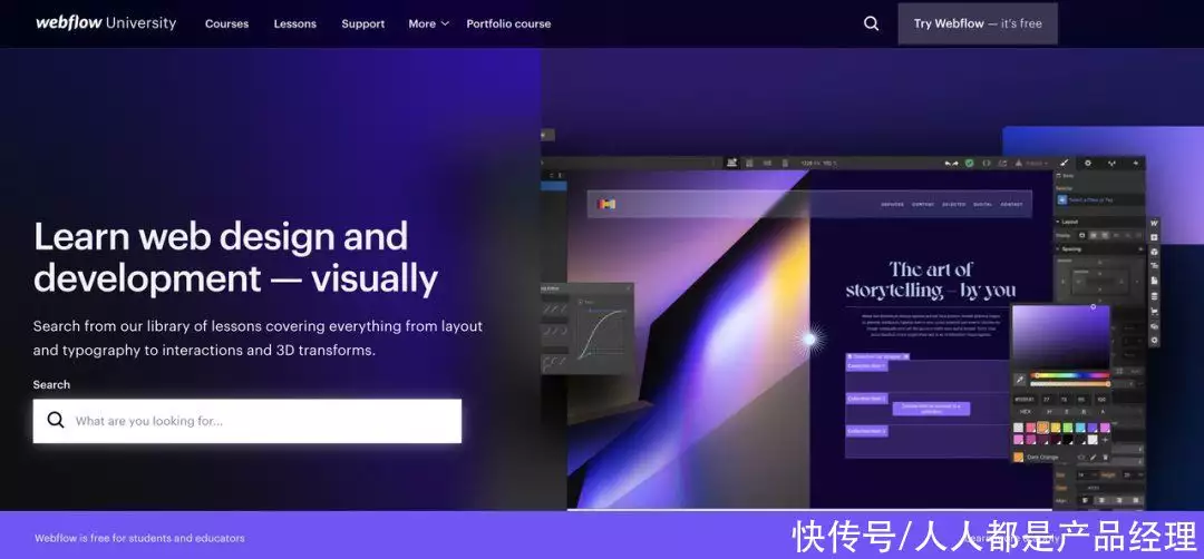 下面我们分别来讲讲每种内容的具体情况以及对应的转化路径:1)UniversityWebflow的学院里面包含了从布局、排版到交互以及3D变换等相关的教程这里的内容主要是以视频形式为主,对于像Webflow这样的生产力工具来说,通常都会有一个相应的学习曲线。