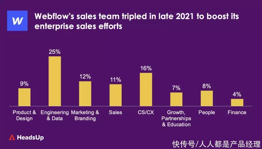 推动Chrome浏览器成为一个应用平台,这使得浏览器的功能变得更加强大,这位Webflow的诞生奠定了非常重要的基础在组织架构上,去年HeadsUp搜集整理了相关的数据,从总数上看一共是340人,最高层是3位联合创始人,然后下面会分出产品(17人)、产品设计(13人)、工程(78人)、数据(6人)、市场(33人)、品牌(9人)、销售(37人)、客户成功/客服(56人)、增长(13人)、合作伙伴(5人)、培训(5人)、人事(26人)、财务(12人)、QA/QC(7人)、法务(8人)、IT(2人)这些部分,并且由相应的VP或者负责人进行管理。