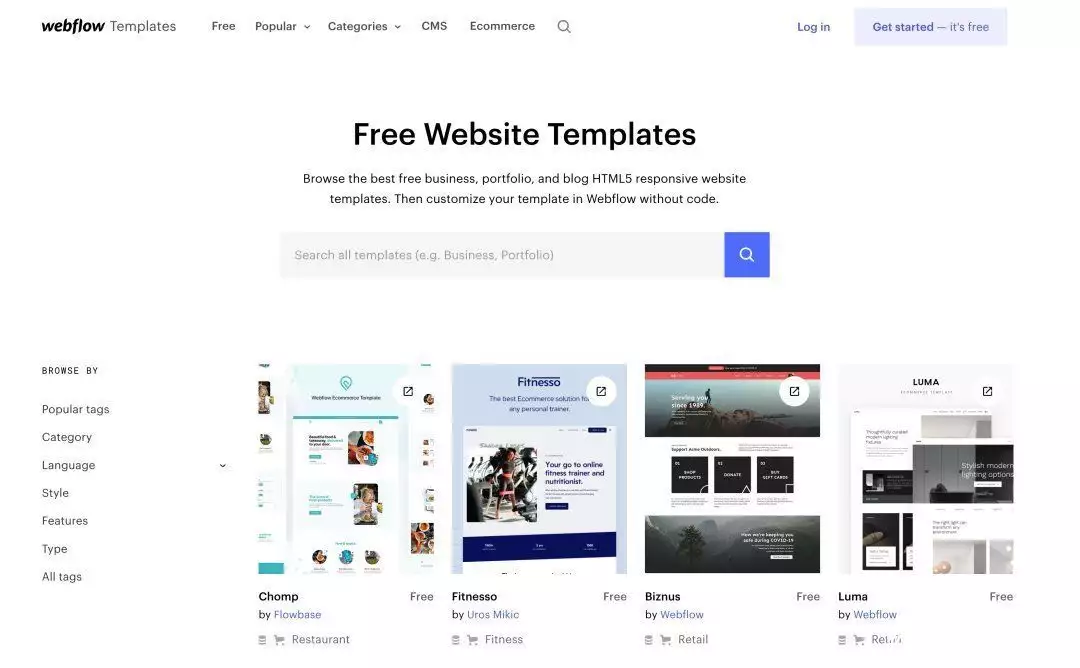 当用户点击链接后,就会打开Webflow专门的免费模版合集页,用户可以根据不同行业类型筛选相对应的模版,同时也可以直接通过搜索来快速找到自己需要的模版。