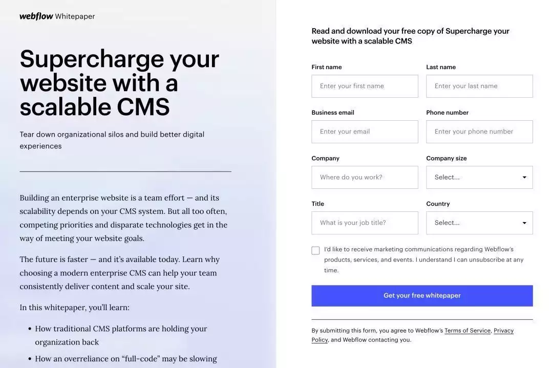 4)Ebooks电子书和白皮书可以看作是更加系统性的干货内容,里面包含了无代码、设计、自由职业和网站开发等等实用内容这些内容也都是免费的,但跟博客不一样的是用户需要填写姓名、邮箱、电话、公司名称和职位等信息后才能下载相关的文件。