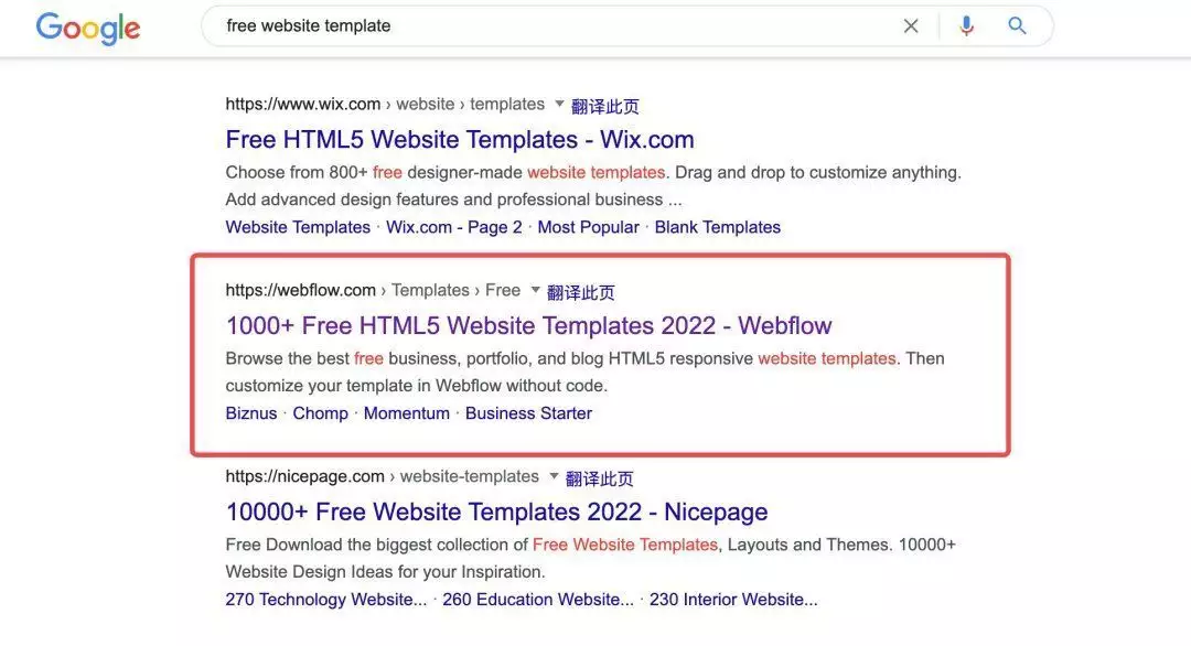 而对于Webflow这样一款生产力工具来说,模版是很好降低用户Time To Value(发现价值所需的时间)的手段Webflow在“free website templates”这个关键词的结果上拥有很高的排名,并且在标题中用了1000+、Free以及2022等核心词来吸引用户点击,突出了数量多、免费和更新快等特点。