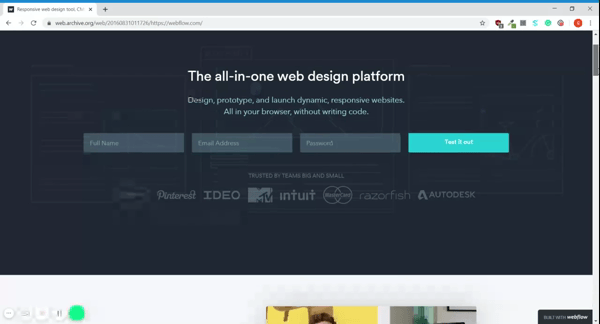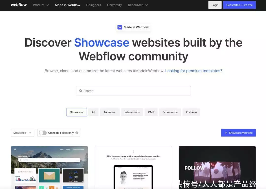 在2014年,Webflow又在论坛形式的社区基础上,增加了专门的作品展示页(https://webflow.com/made-in-webflow/showcase),用来展示社区成员通过Webflow制作出的网页。