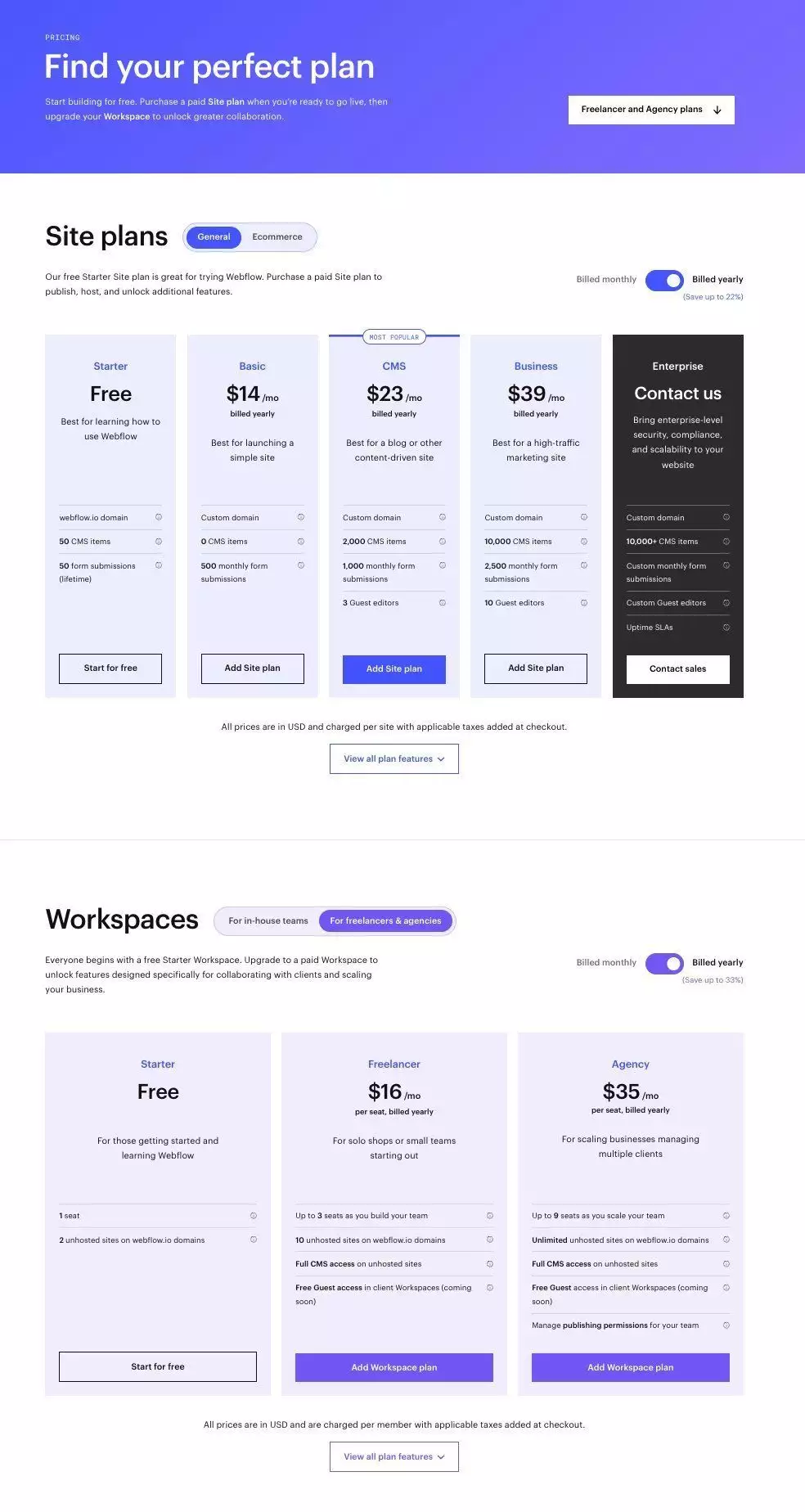 在定价模式上,Webflow采用的是Freemium(免费增值)的模式,也就是说用户可以直接免费使用Webflow来设计、制作并发布网站,但当需要用到某项增值服务时,则需要付费来升级套餐如下图所示,目前Webflow上的付费套餐主要可以分为两大类,分别是。