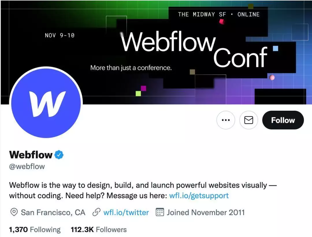 而在其他如Facebook、Twitter和Linkedin等社交平台上,Webflow平均关注量都在10万左右,这些平台上的内容基本都是相同的,以信息发布为主。