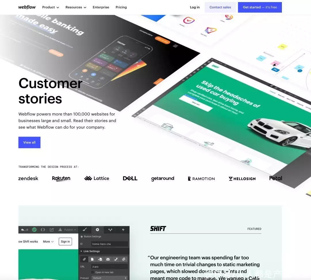 3)Customers这里主要都是一个个客户案例,来说明不同客户用Webflow实现了哪些功能,满足了他们什么样的需求很明显,这一块内容主要针对的就是商家和企业版客户这也是属于之前提到过Social Proof的内容,一方面可以让初次接触的用户很清楚地了解自己可以通过产品达到什么样的效果,另外一方面也可以通过实际的案例和客户故事增强新用户的信任。