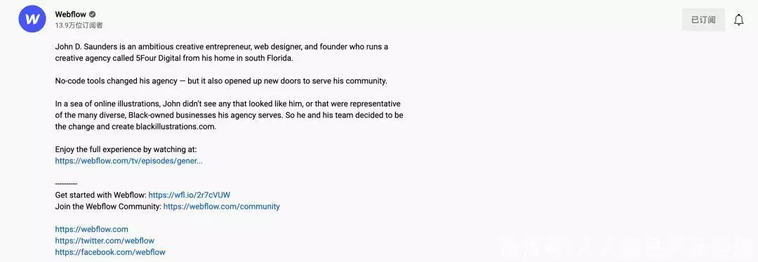 每个视频的描述栏中会插入相关的链接,比如上文提到过的University和Community的链接,从而将Youtube上的流量往Webflow站内进行导流。