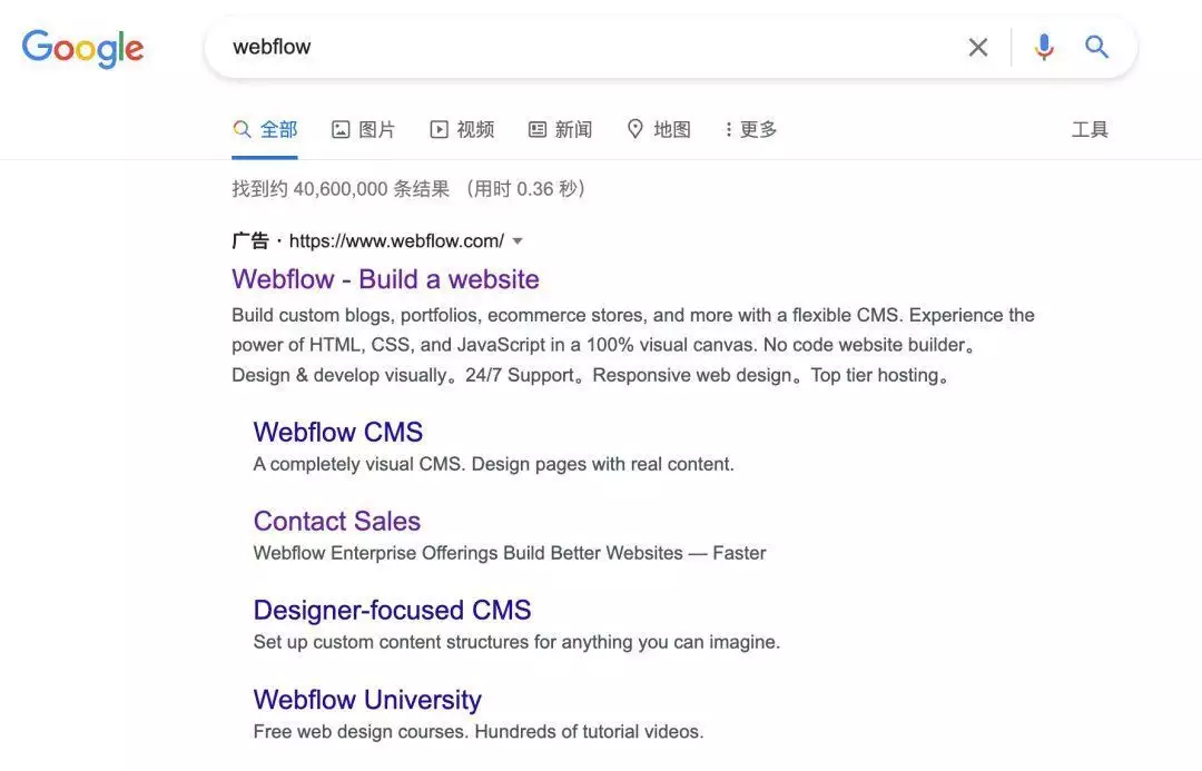 而在Google上面则主要是关键词广告,比如品牌关键词Webflow等,能够吸引以目标驱动的人群访问网站,并进行转化。