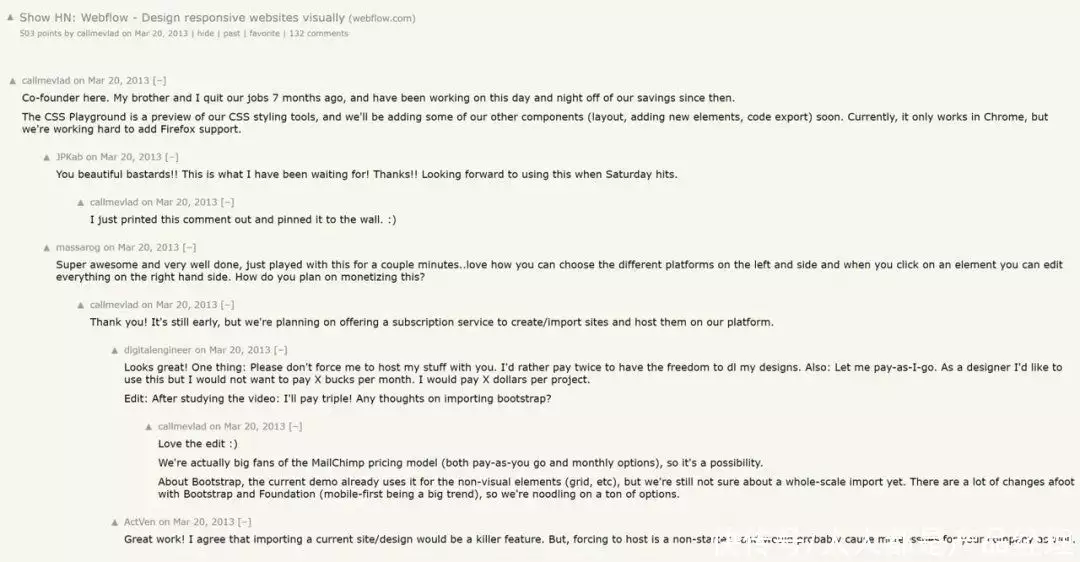 在面试结束后,几个创始人非常忐忑不安,因为他们觉得面试的时候太紧张了,发挥得不怎么样但幸运的是,最终他们收到了YC的Offer电话正当他们非常开心,订了餐厅准备和家人庆祝一番时,乌龙事件发生了,他们又突然收到了YC的拒绝邮件,里面写到YC拒绝了他们,因为之前就有太多类似的idea,YC担心Webflow最终会因为产品对于非技术人员来说上手难度太高,对于技术人员来说又没有太多价值,从而陷入一个进退两难的尴尬境地,而导致失败。