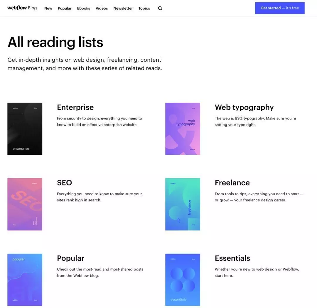 并且Webflow还很贴心的根据不同人群归类了不同主题的Reading List,每个主题下面都有整理好的类似文章,这样可以进一步增强对用户的吸引力和留存率,体现自己的专业度。