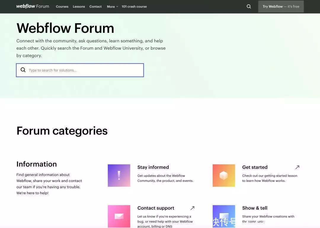 5)Community社区是Webflow内容战略重要的一环,在上文中也提到了,跟其他种类内容不一样的地方是,社区的内容是通过UGC的方式在源源不断产生,持续为SEO提供动力来源在具体形式上来说,主要是以论坛讨论帖子的方式产出内容,Webflow根据不同内容属性划分了不同的子板块,每个对应板块中的内容主要以提问、教程和展示类帖子为主。