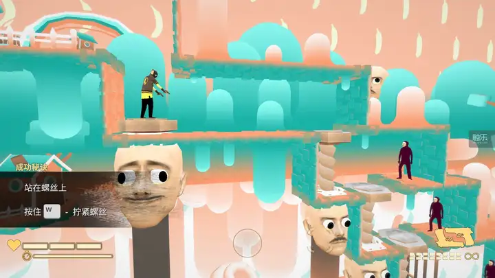 接近7个小时的流程下来,我从没有遇到“卡关”或是因世界地图机制产生的死循环,一切都是那么流畅过瘾就像整个故事的艺术风格那样,《我的好友胡安》也有一些荒诞可笑的迷宫存在,比如胡安的“脑内世界”是一个艺术风格清奇、充满诡异色彩的“奖励迷宫”,在玩者刚刚结束一段刺激过瘾的遭遇战,肾上腺素含量正急剧下降时,就会看到一个被粉色的诡异物体以及奇怪人脸包裹的世界。
