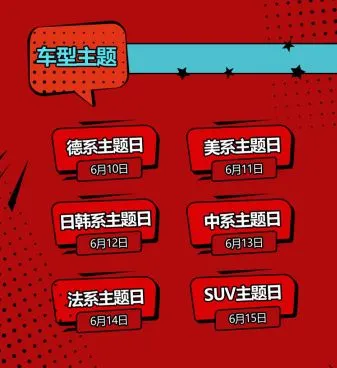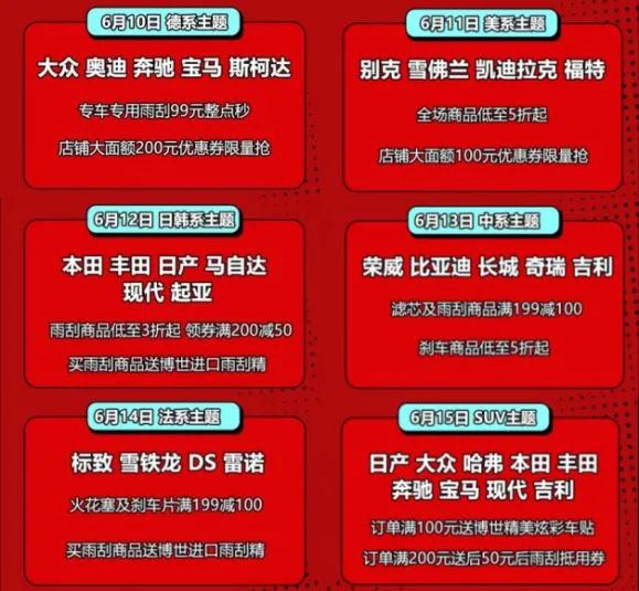 日系、美系、法系、中系、日韩系、SUV系无论你是哪个系,都将拥有你的专属主题日活动,主题日当天可享多件多折,满减优惠券叠加使用!还有博世限量版定制车贴赠送哦!