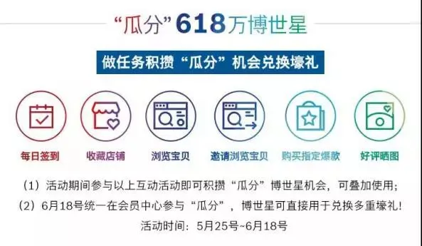 v 刮分618万博世星 开启博世星宝盒博世会员们的福利又来啦!5.25-6.18期间,在博世会员中心页面参与签到、关注店面、加购收藏、浏览宝贝等简单互动,即可在618当天参与“瓜分”618万博世星!