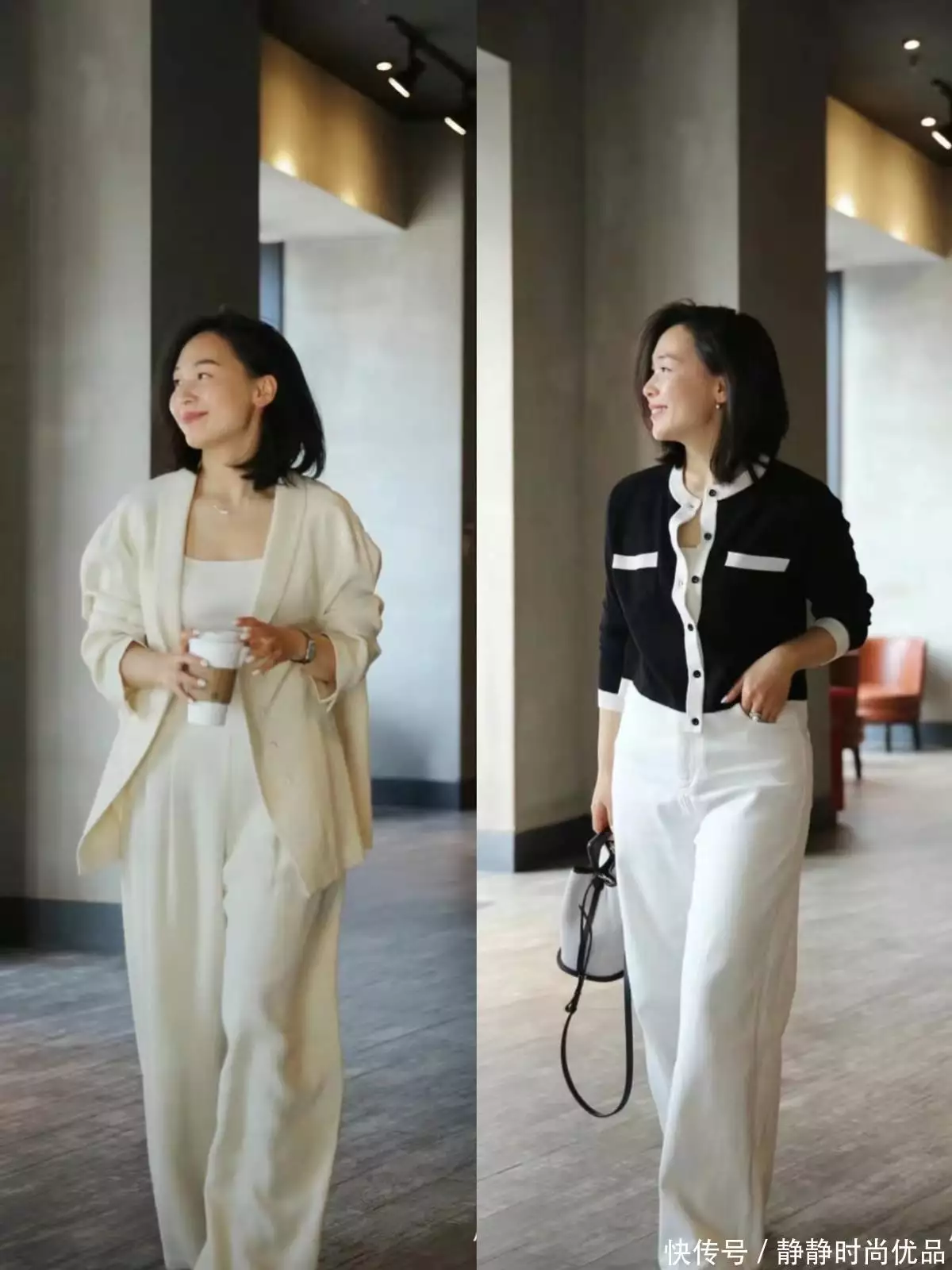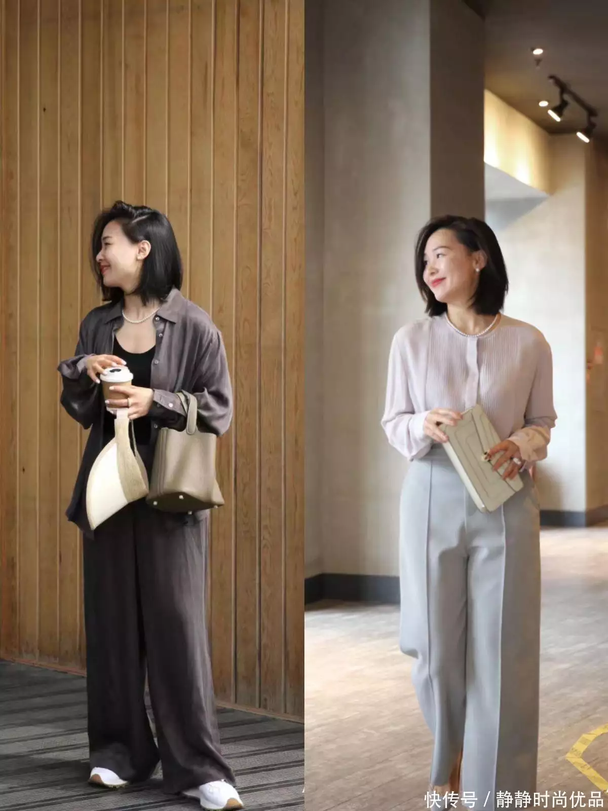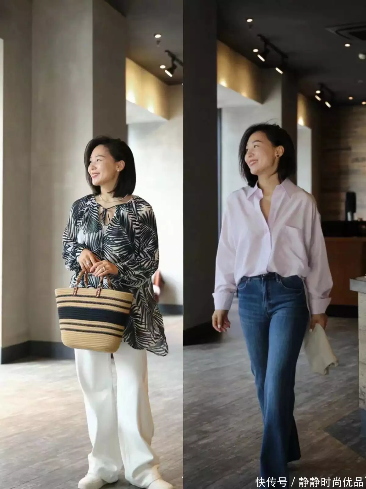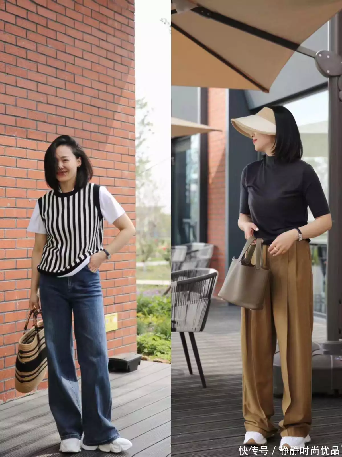 四、白苞身形出游穿搭出游的穿搭,舒心又轻松即可,衬衣作为四季都可穿的配饰,它既随意又修身,所以出行穿它是不错的选择鞍斑阔腿的衬衣,修身显腿长能弱化年龄,配搭背心呈现叠穿的效果,收紧的裤脚结构设计,配搭运动鞋,拉高了身形比例,僵硬又运动的穿搭。