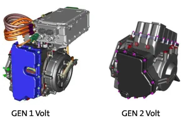 ↑VoltecPW掌控系统第二代(左,4ET50)与第三代(右,5ET50)对比图示意图右图,随著TPIM总成组件软件系统进变速器胃部,第三代Voltec不但体积大幅减少,因此总重量也以求减轻全套驱动力装置单元及驱动力装置器总重量仅为125kg。