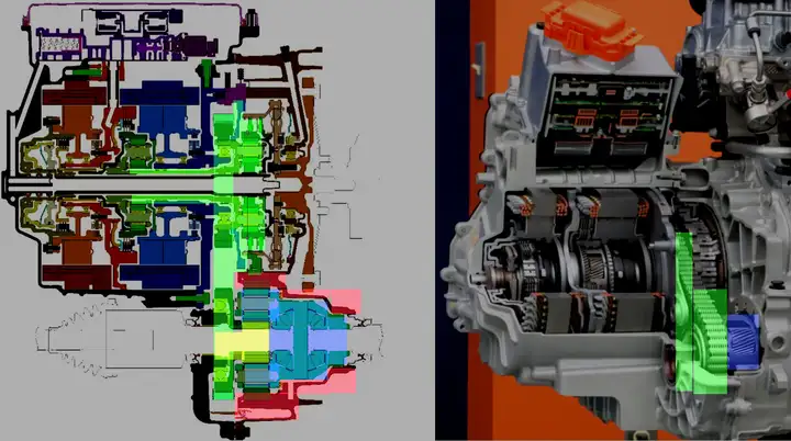 ↑电气A及离合器C1&C2原理剖面示意图(左)与实物剖面示意图(右)(绿色部分)固定于动力装置电气A定子的C1离合器总成(红色部分)电气A总成(黄色部分)C2离合器总成