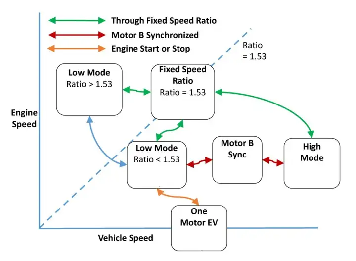 ↑多商业模式智能化转换关系图(来自GM SAE论文)TPIM总成组件不但进行电气驱动力装置掌控,因此防守型混和动力装置驱动力装置器负责管理工作扭力重新分配和热量管理工作通过通用型专利权的多商业模式智能化转换技术,TPIM总成组件可以根据不同的限速、发动机输出功率选择最优化的组织工作商业模式。