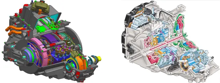 ↑高度软件系统的智能化PW掌控系统(左)与传统变速器(右)体积相似示意图右图,左侧的新一代PW动变速器5ET50和传统车型使用的6AT变速器6T50系列具有相当的体积因此两种类型的变速器均采用了链轮加行星齿轮减速器的结构连接至输出轴差速器。
